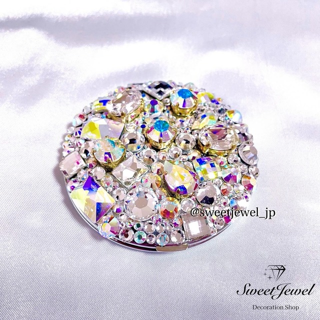 ※こちらは展示品です。 ⚫︎ビジューコンパクトミラー 贅沢に全てスワロフスキーを使用! クリスタルとクリスタルABの立体感のあるストーンを石座に乗せてデコレーションしてます。 昔の作品なので今は生産終了してしまったストーンを沢山使用していますが、代替のストーンでゴテゴテデコレーションも可能です◎ \\オーダー受付中// こんな物、こんなデザインできる?等、お気軽にお問い合わせお待ちしております♪ 公式LINE▶︎▶︎https://lin.ee/LR4nxGD
